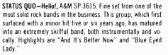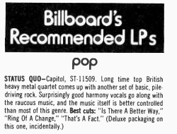 Le 19 juin 1975, Status Quo entreprend sa cinquième tournée américaine et canadienne. Elle comprend 28 dates et le groupe tourne avec des pointures telles que ZZ Top, Aérosmith ou encore Black Sabbath. Capitol, la nouvelle maison de disques chargée de la distribution de disques, aux USA, en profite pour sortir, à nouveau, le single 'Down down'. Inutile de préciser que l'échec est à nouveau au rendez-vous. Pourquoi ce morceau, que les radios américaines refusent de diffuser, rencontrerait-il un succès inexistant six mois auparavant ??? Qu'à cela ne tienne, on tourne la page de 1975 pour se projeter sur 1976 et une autre approche. Cette fois-ci, Status Quo va tourner du 30/03 au 08/05 avec une tournée totalement financée par le management du groupe. 27 concerts avec de gros calibres dans de grandes salles voire des stades ainsi qu'une grosse promotion dans le Billboard du 3 avril doit permettre à l'album 'Blue for you' renommé simplement 'Status Quo' pour les marchés américains et canadiens de décoller. Ca n'arrivera pas, cette galette n'atteindra que la 148ième place du classement de ventes d'albums aux Etats-Unis annonçant le glas des derniers espoirs de succès . Une ultime tentative, l'année suivante, avec 'Rocking all over the world', pourtant mixé spécialement par Pip Williams pour séduire le marché américaine, restera vaine. Le dernier single édité par Capitol, 'Wild side of life', subira le même sort que ses prédécesseurs.