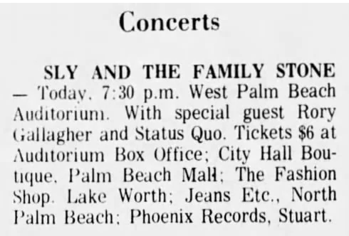 29. 30/08. West Palm Beach, Auditorium (USA) Première partie : Sly & The Familly Stone